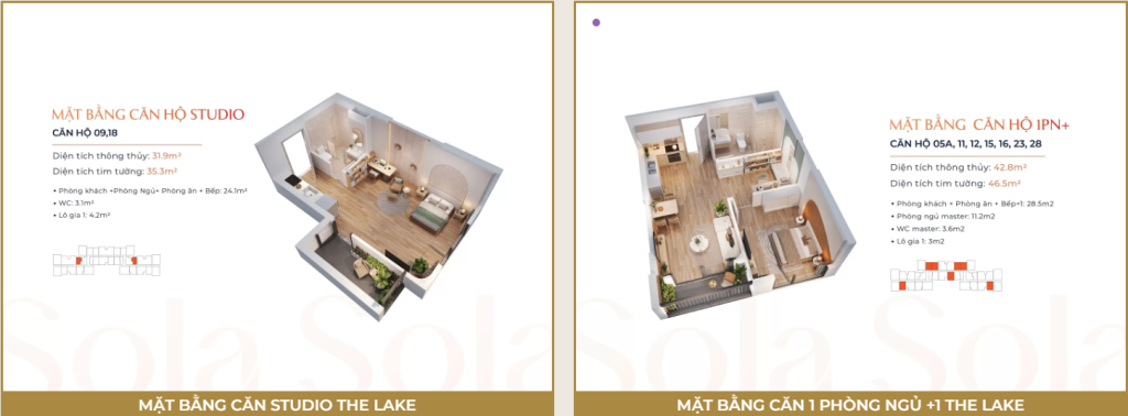 Căn hộ The Lake sở hữu thiết kế đẳng cấp và đa dạng các loại hình căn hộ bao gồm Studio, 1 ngủ, 2 ngủ, 3 ngủ, Duplex và Penthouse với diện tích từ 35 – 200m2. Layout các căn hộ đều được tối ưu hóa công năng sử dụng với thiết kế hiện đại vô cùng sang trọng và tinh tế.