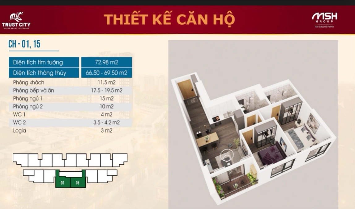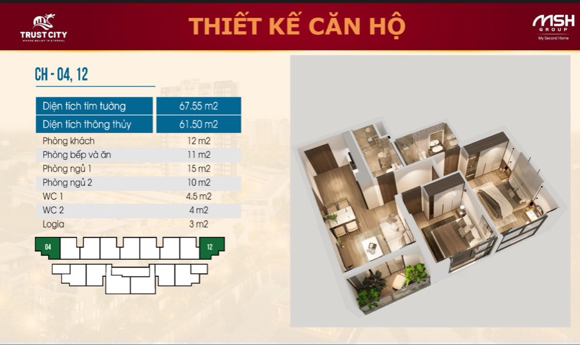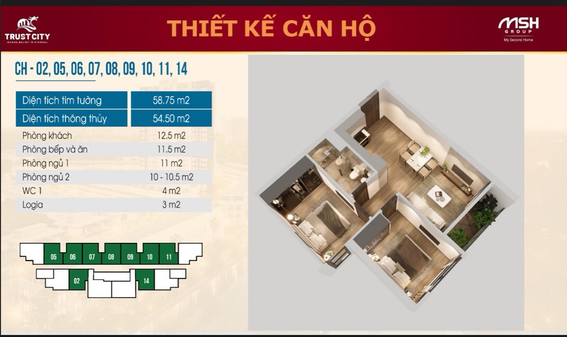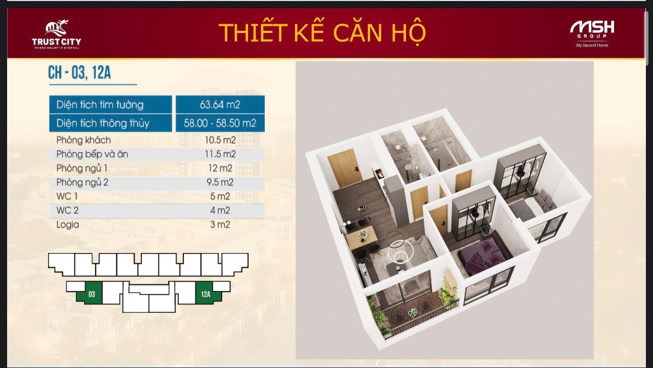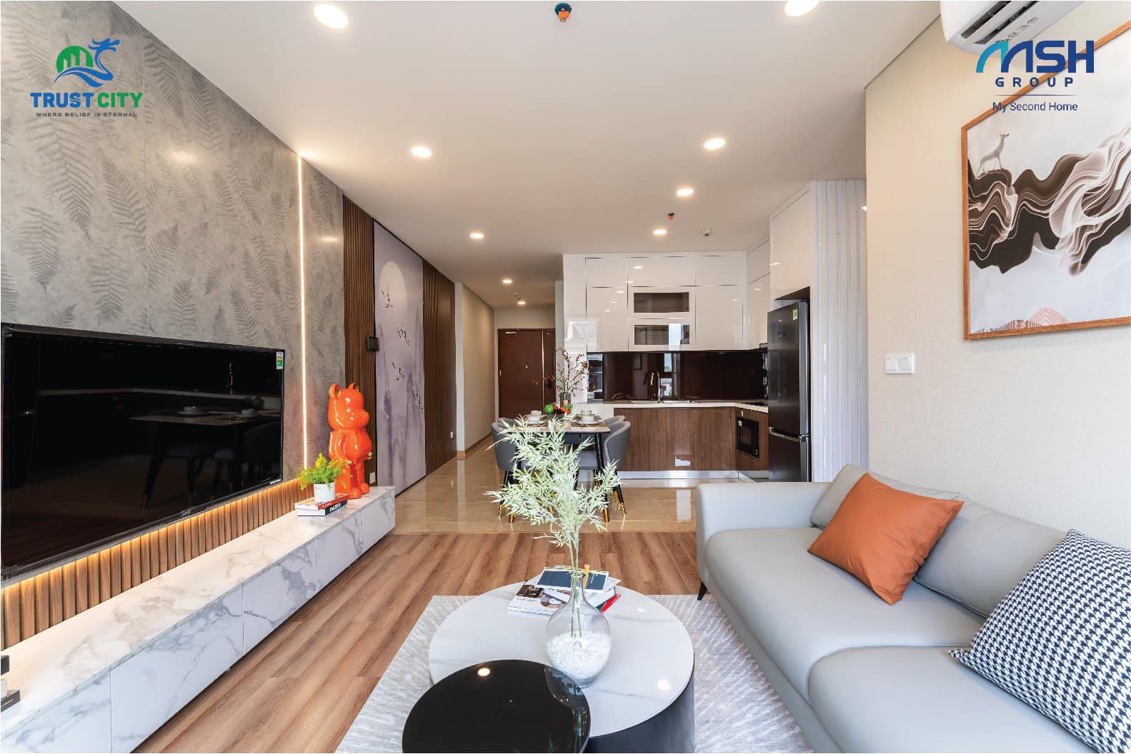 Tổ hợp căn hộ Trust City bao với 500 sản phẩm. 2 tầng hầm gửi xe, đảm bảo cung cấp đủ chỗ đỗ xe cho toàn bộ cư dân. Các sản phẩm tại đây được thiết kế hợp lý và tối ưu diện tích sử dụng với loại căn 2PN diện tích từ 50 – 60m2.