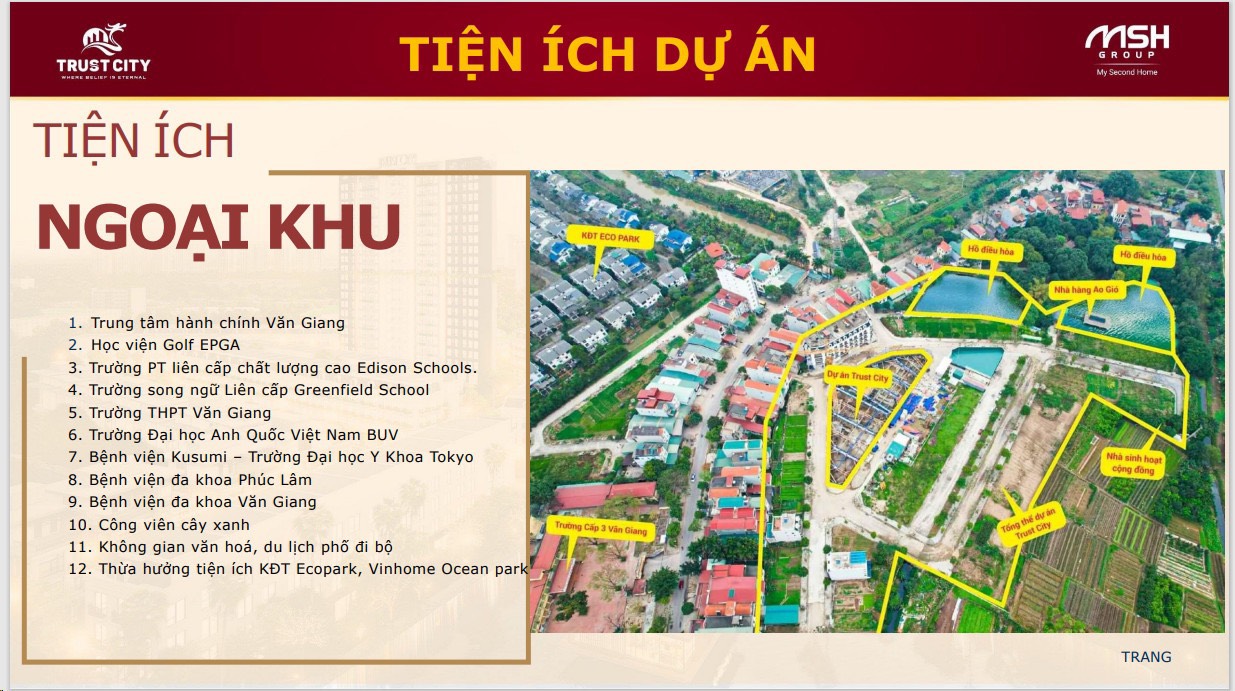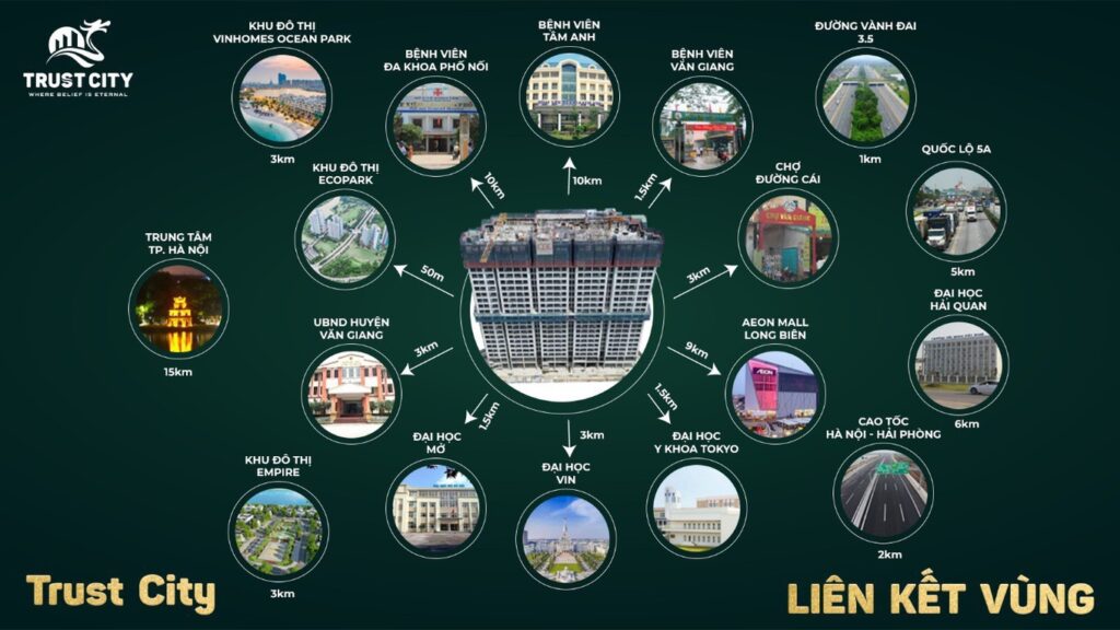 Sở hữu vị trí đắt giá bậc nhất quần thể đô thị lõi 47ha Văn Giang (Hưng Yên), Trust City tự hào làm chủ giao lộ trung tâm, kết nối tối đa hệ thống hành chính – giải trí – kinh tế – xã hội khu vực. Nhờ lợi thế nằm trên giao điểm của các đô thị lớn là Ecopark, Vinhomes Ocean Park, Vinhomes Dream City, Trust City cộng hưởng hệ thống tiện ích đẳng cấp hàng đầu thế giới chỉ trong 15′ di chuyển. Bên cạnh đó, với lợi thế về hạ tầng giao thông kế cận, dọc theo đường cao tốc Hà Nội – Hải Phòng, đường liên tỉnh Hà Nội – Hưng Yên, đường 5A Hà Nội – Hưng Yên… giúp cư dân di chuyển dễ dàng đến khu vực nội đô và các tỉnh lân cận chỉ khoảng 30′ di chuyển.