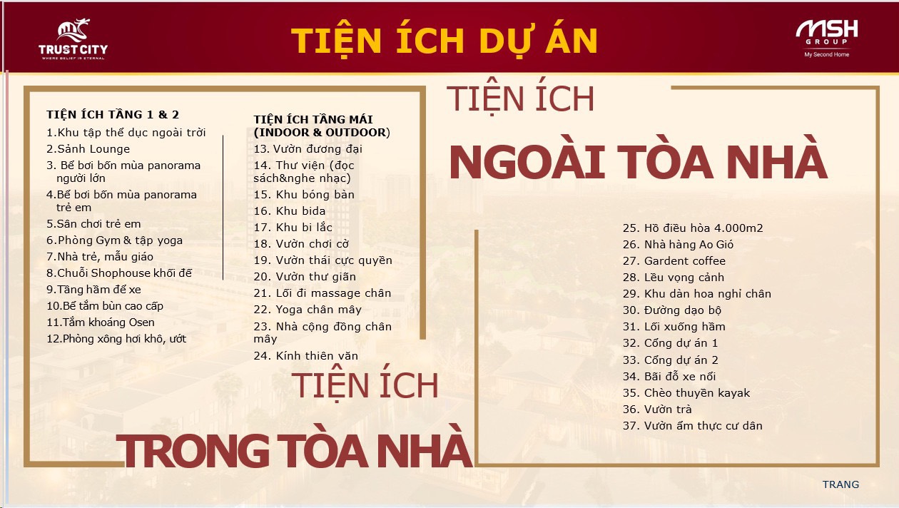 Các tòa căn hộ Trust City được thiết kế theo hình dạng chữ I để đón ánh sáng tự nhiên 100%. Với mật độ thấp – chỉ 10 căn/tầng, mỗi tầng sở hữu 6 thang máy và tầng hầm sẽ là một trong số các tiêu chuẩn “cao cấp” mang đến cho cư dân một cuộc sống tiện nghi và đẳng cấp.
