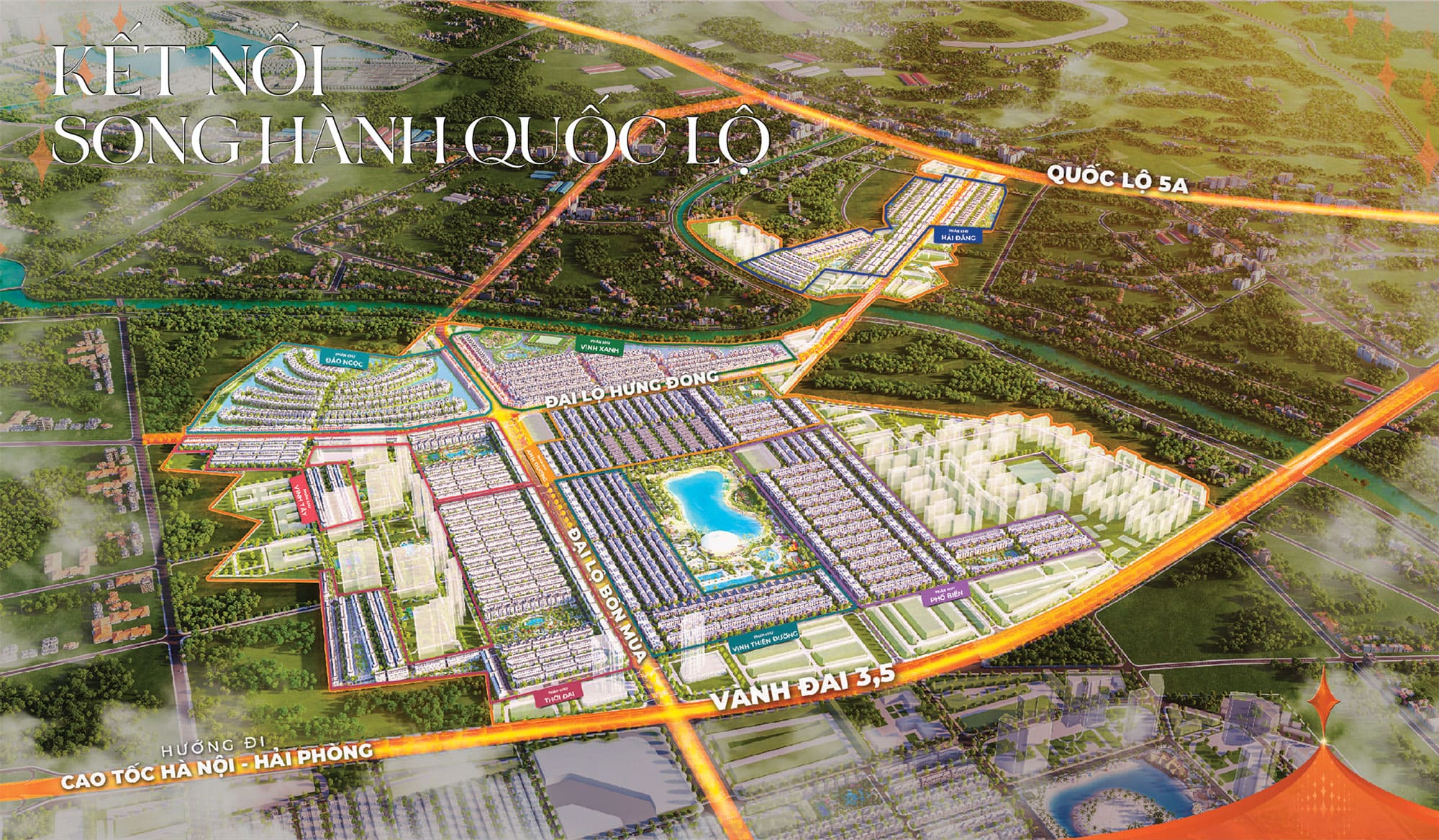 - Hà Nội: Chỉ cách trung tâm Hà Nội khoảng 25 phút di chuyển qua cao tốc Hà Nội – Hải Phòng, cư dân dễ dàng tiếp cận các tiện ích và dịch vụ đa dạng của thủ đô.